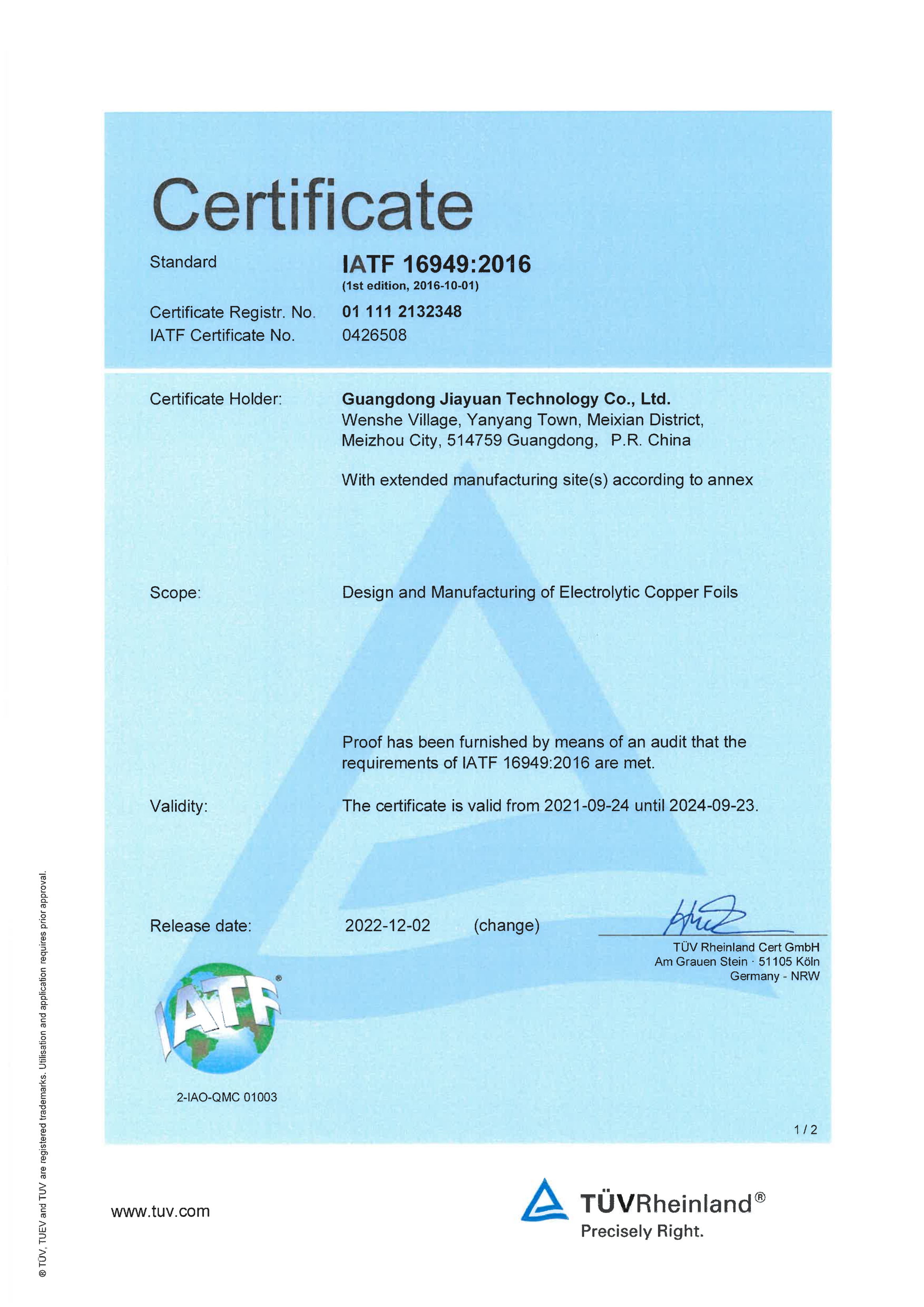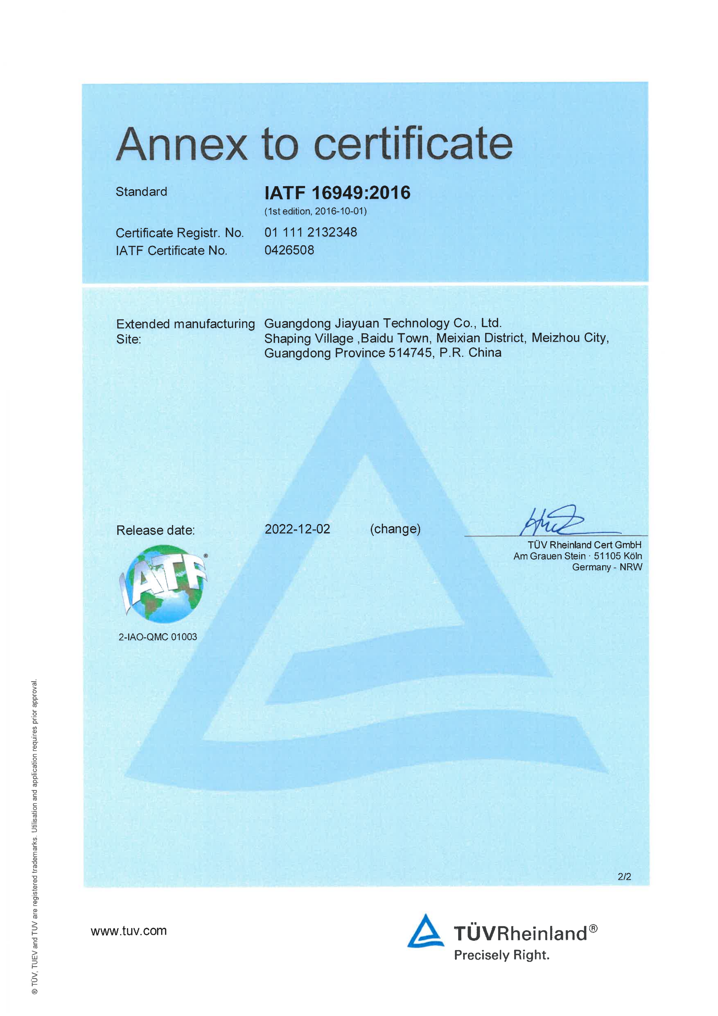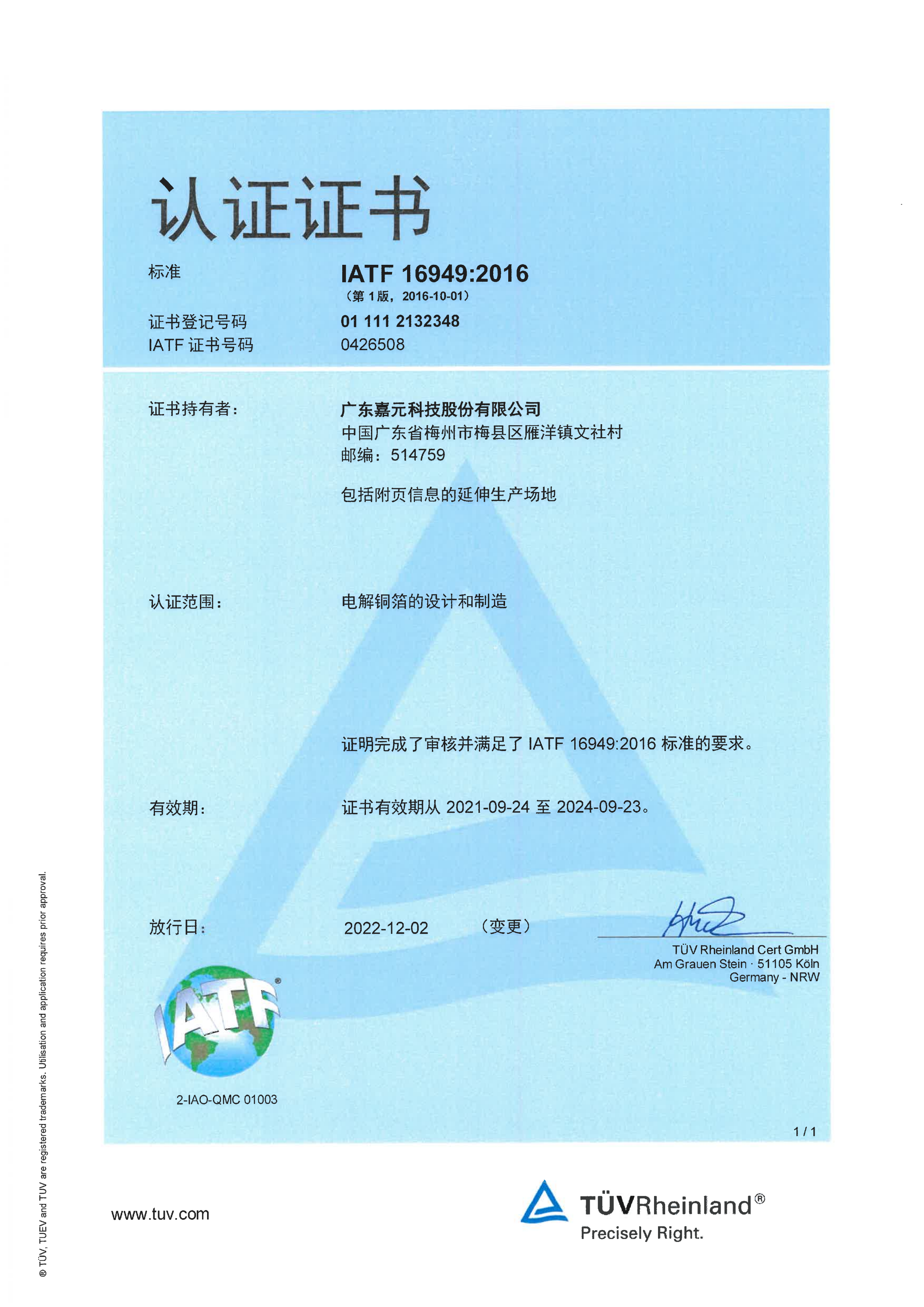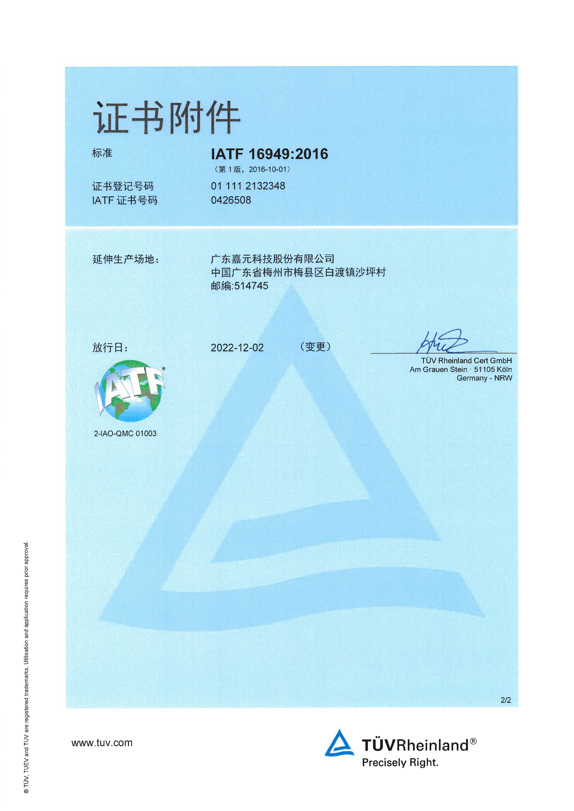 IATF 16949:2016認證證書