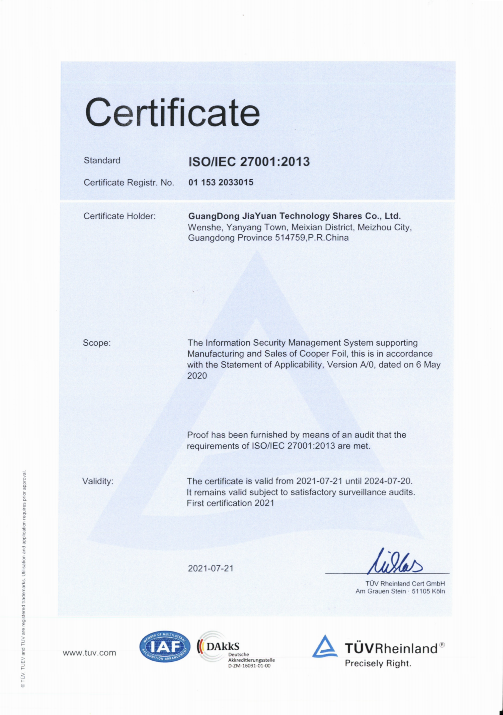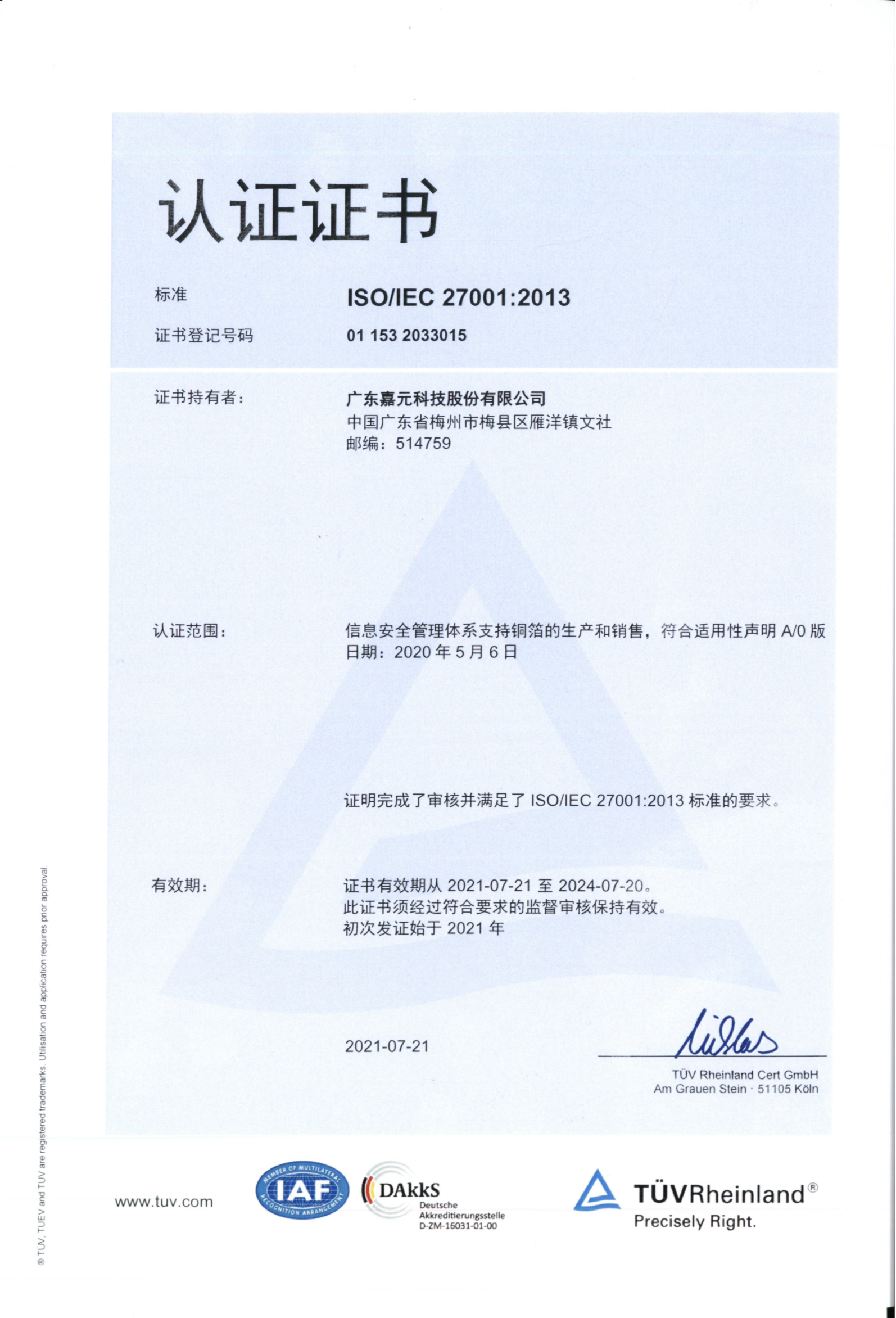 ISO/IEC 27001:2013認(rèn)證證書